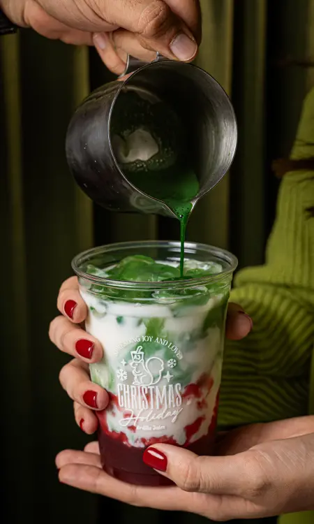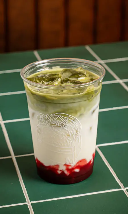 Matcha japonés con un swirl de fresa natural y leche deslactosada o almendras. Suave, rosado y con ese boost de energía que te enamora desde el primer sorbo.