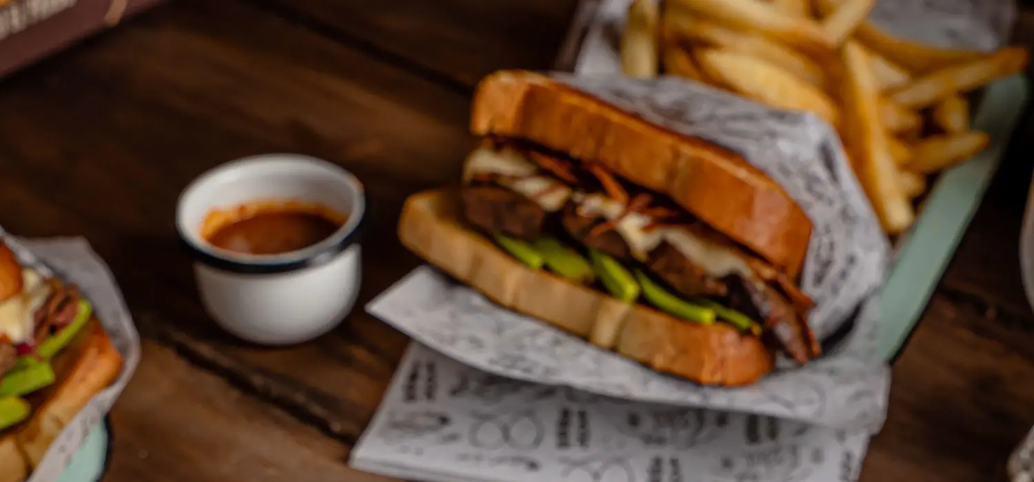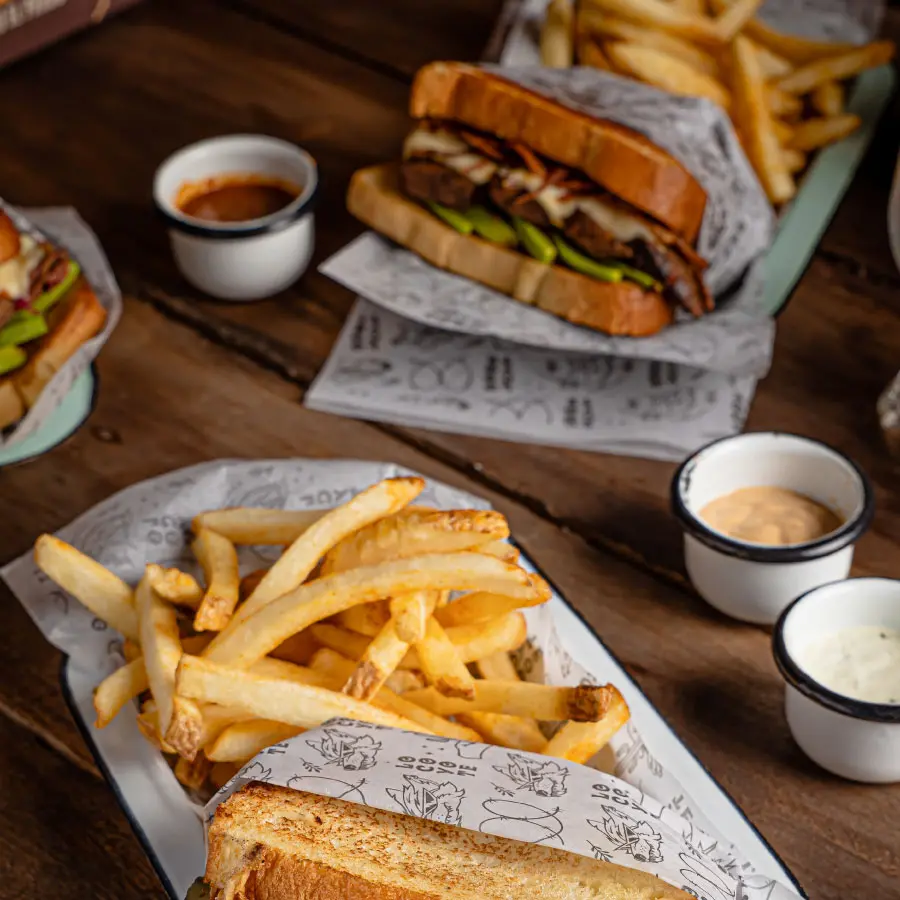 Costillas de cerdo tipo st. Louis ahumada por 10h, jugosa y sin hueso, pan brioche, queso mozzarella, queso americano, pimentón tatemado y piña ahumada. Incluye papas a la francesa.