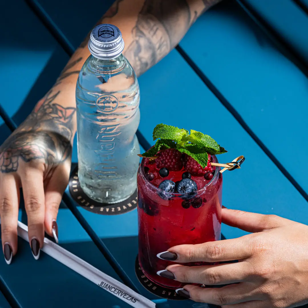 Red fruit juice, lemon juice, orange juice, completed with Corona Zero beer, mint leaf, and a skewer of golden berries.