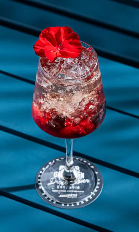 120ml de vino tinto, zumo de limón, syrop simple, completado con ginger, flor comestible y naranja deshidratada.