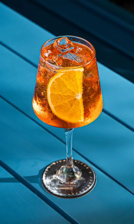 Cóctel clásico italiano refrescante y ligeramente amargo. 50ml de Aperol, 90ml de Prosecco, completado con soda bretaña y acomapaño de un slice de naranja tangelo.