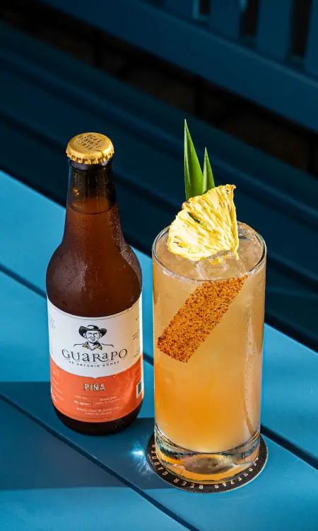 50ml Tequila Olmeca blanco, zumo de limón, guarapo boyacense Antonio Gomez, completado con Juniper de toronja, brocha de chamoy con tajín, hojas de piña y un slice de piña deshidratada.